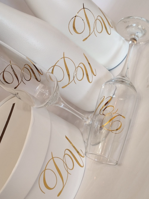У нас вы можете приобрести наклейки инициалы на свадебные бутылки и бокалы, аксеесуары.