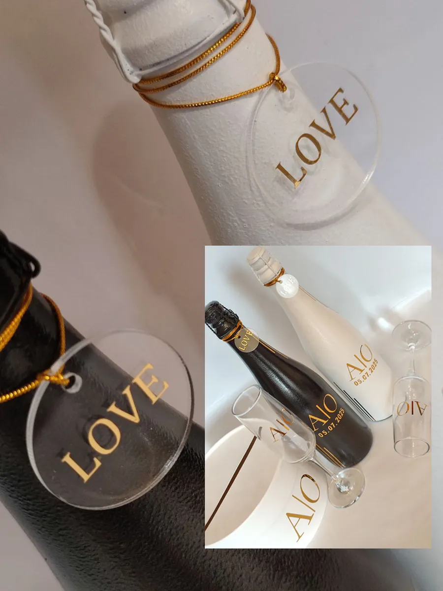 Набор бирок для украшения свадебных бутылок. В комплекте 2 бирки с веревочками. Материал органическое стекло, золотая зеркальная пленка. Диаметр бирки 3,5 см.