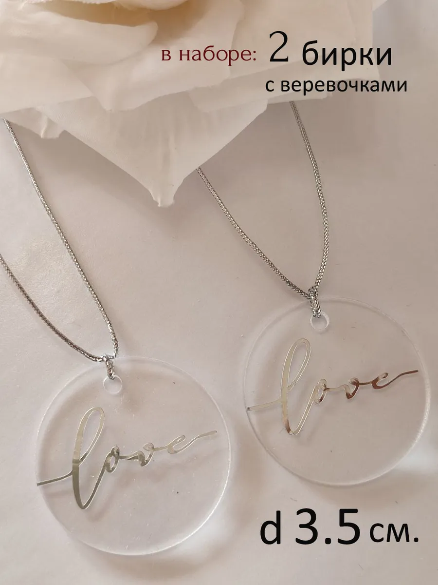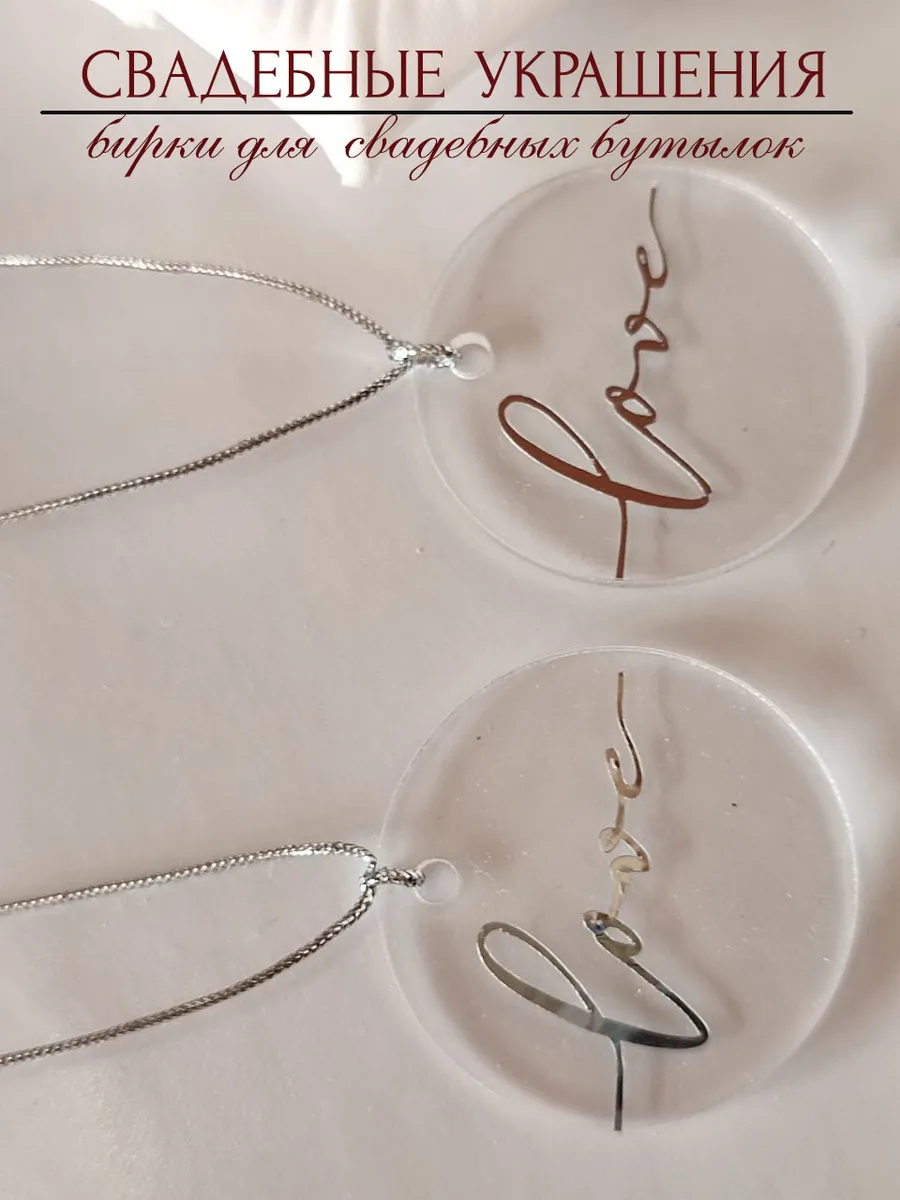 Набор бирок для украшения бутылок. В наборе 2 бирки с веревочками в комплекте. Диаметр бирки 3,5 см. Материал органическое стекло, зеркальный винил.