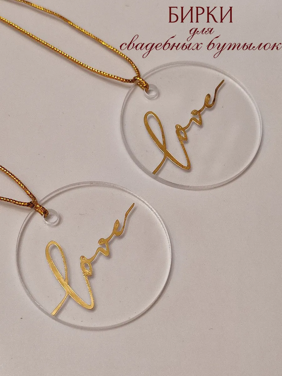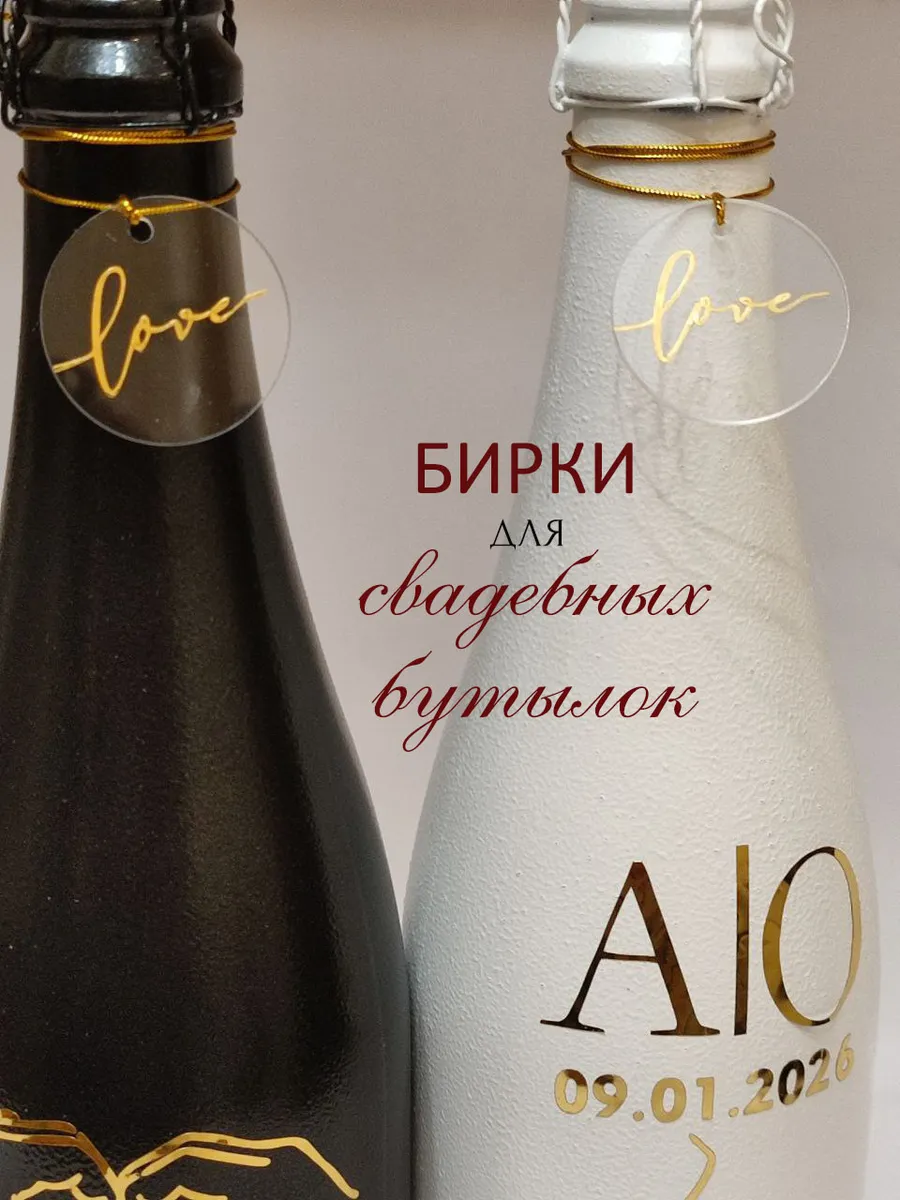 Набор бирок для украшения бутылок. В наборе 2 бирки с веревочками в комплекте. Диаметр бирки 3,5 см. Материал органическое стекло, зеркальный винил.