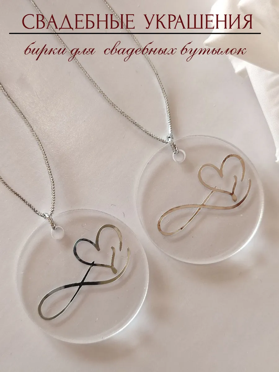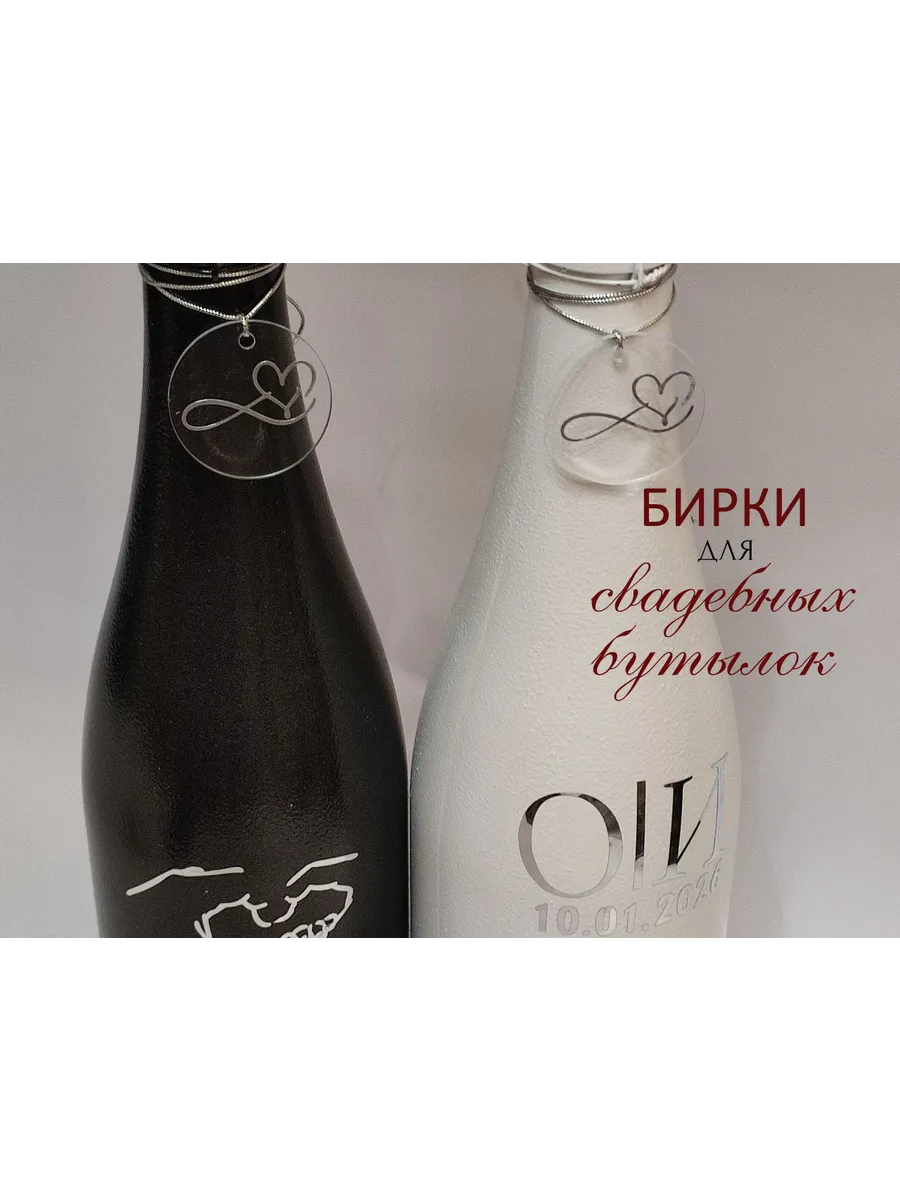 Набор бирок для украшения бутылок. В наборе 2 бирки с веревочками в комплекте. Диаметр бирки 3,5 см. Материал органическое стекло, зеркальный винил.