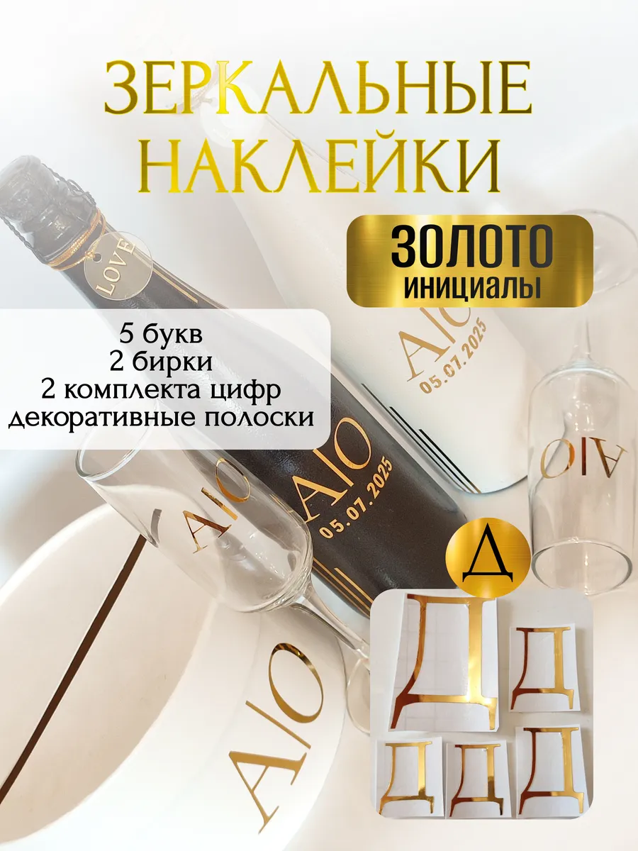 Набор наклеек из зеркального золота – отличный выбор для украшения бутылок и бокалов? Они добавят изысканности и блеска Вашему мероприятию, придавая ему особую изюминку. Эти наклейки идеально подходят для нанесения на любые бутылки и свадебные фужеры с гладкой поверхностью. Благодаря специальной клеевой основе они легко фиксируются на поверхности. Вы сможете их использовать не только для стеклянной посуды, но и для окрашенных поверхностей, создавая уникальные декорации. Идеальный выбор для свадебных торжеств. Эти декоративные элементы помогут создать особую атмосферу романтики и подчеркнет статус торжества. В наборе 6 букв ( инициалы для 2-х бутылок, для 2-х бокалов, для семейного банка), две бирки с надписью "LOVE", два золотистых шнура для бирок, два комплекта цифр (для любой дата 2025-2026), декоративные золотые полоски. Размеры наклеек отлично подходят под стандартные размеры свадебных аксессуаров, благодаря этому вы сможете создать гармоничный и стильный дизайн, соответствующий атмосфере и особенностям Вашего мероприятия. В карточках товаров магазина можно выбрать любые инициалы алфавита. Очистите бутылки от этикеток. Осторожно отделите прозрачную с наклейкой от белой подложки чтобы все элементы остались на прозрачной пленке. Нанесите наклейку на выбранное место, аккуратно разгладьте. Удалите прозрачную пленку. свадебные наклейки на бутылки; наклейки на бокалы; наклейки на шампанское свадебное; шаблоны свадебных наклеек; свадебные наклейки купить; наклейки на свадебные бокалы; наклейки на свадебные бутылки; свадебные наклейки на бутылки шампанского;
