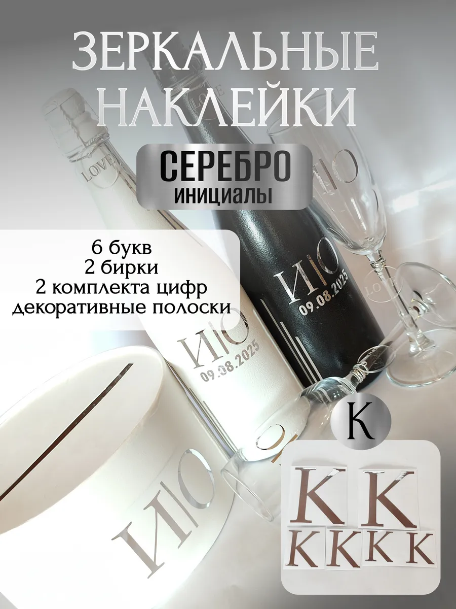 Набор наклеек из зеркального серебра – отличный выбор для украшения бутылок и бокалов? Они добавят изысканности и блеска Вашему мероприятию, придавая ему особую изюминку. Эти наклейки идеально подходят для нанесения на любые бутылки и свадебные фужеры с гладкой поверхностью. Благодаря специальной клеевой основе они легко фиксируются на поверхности. Вы сможете их использовать не только для стеклянной посуды, но и для окрашенных поверхностей, создавая уникальные декорации. Идеальный выбор для свадебных торжеств. Эти декоративные элементы помогут создать особую атмосферу романтики и подчеркнет статус торжества. В наборе 6 букв ( инициалы для 2-х бутылок, для 2-х бокалов, для семейного банка), две бирки с надписью "LOVE", два серебристых шнура для бирок, два комплекта цифр (для любой дата 2025), декоративные серебрянные полоски. Размеры наклеек отлично подходят под стандартные размеры свадебных аксессуаров, благодаря этому вы сможете создать гармоничный и стильный дизайн, соответствующий атмосфере и особенностям Вашего мероприятия. В карточках товаров магазина можно выбрать любые инициалы алфавита. Очистите бутылки от этикеток. Осторожно отделите прозрачную с наклейкой от белой подложки чтобы все элементы остались на прозрачной пленке. Нанесите наклейку на выбранное место, аккуратно разгладьте. Удалите прозрачную пленку. свадебные наклейки на бутылки; наклейки на бокалы; наклейки на шампанское свадебное; шаблоны свадебных наклеек; свадебные наклейки купить; наклейки на свадебные бокалы; наклейки на свадебные бутылки; свадебные наклейки на бутылки шампанского;