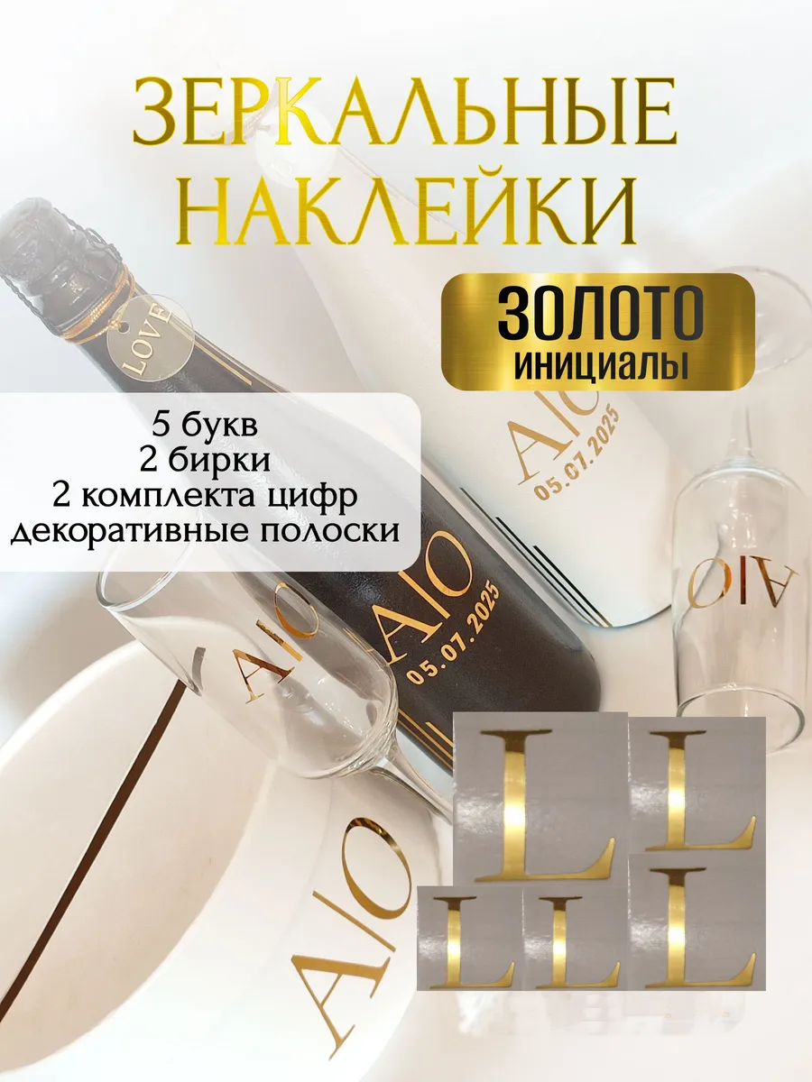 Набор наклеек из зеркального золота – отличный выбор для украшения бутылок и бокалов? Они добавят изысканности и блеска Вашему мероприятию, придавая ему особую изюминку. Эти наклейки идеально подходят для нанесения на любые бутылки и свадебные фужеры с гладкой поверхностью. Благодаря специальной клеевой основе они легко фиксируются на поверхности. Вы сможете их использовать не только для стеклянной посуды, но и для окрашенных поверхностей, создавая уникальные декорации. Идеальный выбор для свадебных торжеств. Эти декоративные элементы помогут создать особую атмосферу романтики и подчеркнет статус торжества. В наборе 6 букв ( инициалы для 2-х бутылок, для 2-х бокалов, для семейного банка), две бирки с надписью "LOVE", два золотистых шнура для бирок, два комплекта цифр (для любой дата 2025-2026), декоративные золотые полоски. Размеры наклеек отлично подходят под стандартные размеры свадебных аксессуаров, благодаря этому вы сможете создать гармоничный и стильный дизайн, соответствующий атмосфере и особенностям Вашего мероприятия. В карточках товаров магазина можно выбрать любые инициалы алфавита. Очистите бутылки от этикеток. Осторожно отделите прозрачную с наклейкой от белой подложки чтобы все элементы остались на прозрачной пленке. Нанесите наклейку на выбранное место, аккуратно разгладьте. Удалите прозрачную пленку. свадебные наклейки на бутылки; наклейки на бокалы; наклейки на шампанское свадебное; шаблоны свадебных наклеек; свадебные наклейки купить; наклейки на свадебные бокалы; наклейки на свадебные бутылки; свадебные наклейки на бутылки шампанского;