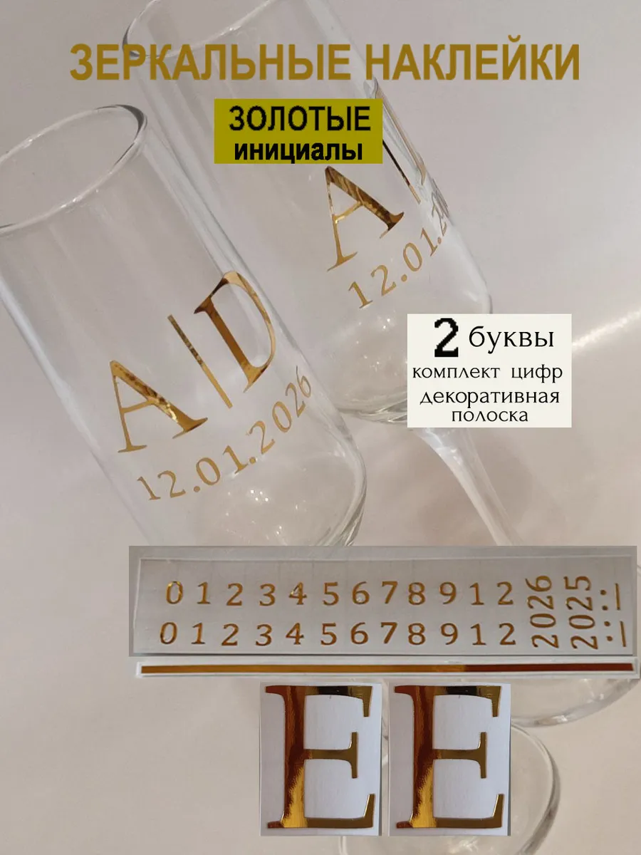 Набор наклеек буквы инициалы и Ваша дата из зеркального золота – отличный выбор для украшения бокалов. Они добавят изысканности и блеска Вашему мероприятию, придавая ему особую изюминку. Эти наклейки идеально подходят для нанесения свадебные бокалы, фужеры с гладкой поверхностью. Благодаря специальной клеевой основе они легко фиксируются на поверхности. Вы сможете их использовать не только для стеклянной посуды, но и для окрашенных поверхностей, создавая уникальные декорации. Идеальный выбор для свадебных торжеств. Эти декоративные элементы помогут создать особую атмосферу романтики и подчеркнет статус торжества. В наборе 2 буквы ( инициалы для 2-х бокалов), декоративная полоска, комплект цифр для любой даты 2025-2026. Размеры наклеек отлично подходят под стандартные размеры свадебных аксессуаров, благодаря этому вы сможете создать гармоничный и стильный дизайн, соответствующий атмосфере и особенностям Вашего мероприятия. В карточках товаров магазина можно выбрать любые инициалы алфавита. Осторожно отделите прозрачную с наклейкой от белой подложки чтобы все элементы остались на прозрачной пленке. Нанесите наклейку на выбранное место, аккуратно разгладьте. Удалите прозрачную пленку. наклейки на бокалы;