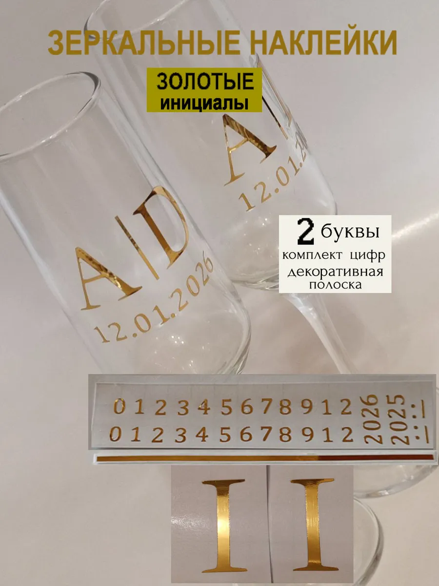 Набор наклеек буквы инициалы и Ваша дата из зеркального золота – отличный выбор для украшения бокалов. Они добавят изысканности и блеска Вашему мероприятию, придавая ему особую изюминку. Эти наклейки идеально подходят для нанесения свадебные бокалы, фужеры с гладкой поверхностью. Благодаря специальной клеевой основе они легко фиксируются на поверхности. Вы сможете их использовать не только для стеклянной посуды, но и для окрашенных поверхностей, создавая уникальные декорации. Идеальный выбор для свадебных торжеств. Эти декоративные элементы помогут создать особую атмосферу романтики и подчеркнет статус торжества. В наборе 2 буквы ( инициалы для 2-х бокалов), декоративная полоска, комплект цифр для любой даты 2025-2026. Размеры наклеек отлично подходят под стандартные размеры свадебных аксессуаров, благодаря этому вы сможете создать гармоничный и стильный дизайн, соответствующий атмосфере и особенностям Вашего мероприятия. В карточках товаров магазина можно выбрать любые инициалы алфавита. Осторожно отделите прозрачную с наклейкой от белой подложки чтобы все элементы остались на прозрачной пленке. Нанесите наклейку на выбранное место, аккуратно разгладьте. Удалите прозрачную пленку. наклейки на бокалы;