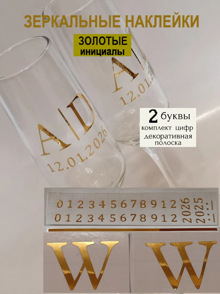 Набор наклеек буквы инициалы и Ваша дата из зеркального золота – отличный выбор для украшения бокалов. Они добавят изысканности и блеска Вашему мероприятию, придавая ему особую изюминку. Эти наклейки идеально подходят для нанесения свадебные бокалы, фужеры с гладкой поверхностью. Благодаря специальной клеевой основе они легко фиксируются на поверхности. Вы сможете их использовать не только для стеклянной посуды, но и для окрашенных поверхностей, создавая уникальные декорации. Идеальный выбор для свадебных торжеств. Эти декоративные элементы помогут создать особую атмосферу романтики и подчеркнет статус торжества. В наборе 2 буквы ( инициалы для 2-х бокалов), декоративная полоска, комплект цифр для любой даты 2025-2026. Размеры наклеек отлично подходят под стандартные размеры свадебных аксессуаров, благодаря этому вы сможете создать гармоничный и стильный дизайн, соответствующий атмосфере и особенностям Вашего мероприятия. В карточках товаров магазина можно выбрать любые инициалы алфавита. Осторожно отделите прозрачную с наклейкой от белой подложки чтобы все элементы остались на прозрачной пленке. Нанесите наклейку на выбранное место, аккуратно разгладьте. Удалите прозрачную пленку. наклейки на бокалы;