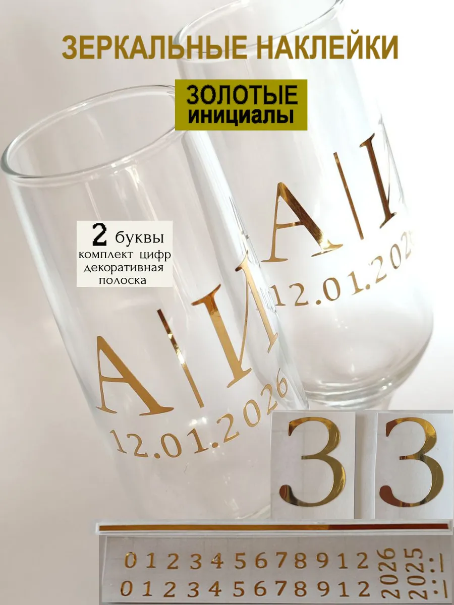 Набор наклеек буквы инициалы и Ваша дата из зеркального золота – отличный выбор для украшения бокалов. Они добавят изысканности и блеска Вашему мероприятию, придавая ему особую изюминку. Эти наклейки идеально подходят для нанесения свадебные бокалы, фужеры с гладкой поверхностью. Благодаря специальной клеевой основе они легко фиксируются на поверхности. Вы сможете их использовать не только для стеклянной посуды, но и для окрашенных поверхностей, создавая уникальные декорации. Идеальный выбор для свадебных торжеств. Эти декоративные элементы помогут создать особую атмосферу романтики и подчеркнет статус торжества. В наборе 2 буквы ( инициалы для 2-х бокалов), декоративная полоска, комплект цифр для любой даты 2025-2026. Размеры наклеек отлично подходят под стандартные размеры свадебных аксессуаров, благодаря этому вы сможете создать гармоничный и стильный дизайн, соответствующий атмосфере и особенностям Вашего мероприятия. В карточках товаров магазина можно выбрать любые инициалы алфавита. Осторожно отделите прозрачную с наклейкой от белой подложки чтобы все элементы остались на прозрачной пленке. Нанесите наклейку на выбранное место, аккуратно разгладьте. Удалите прозрачную пленку. наклейки на бокалы;