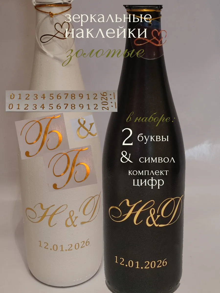 Набор наклеек буквы инициалы и цифры из зеркального золота – отличный выбор для украшения бутылок и бокалов. Они добавят изысканности и блеска Вашему мероприятию, придавая ему особую изюминку. Эти наклейки идеально подходят для нанесения свадебные бутылки или бокалы с гладкой поверхностью. Благодаря специальной клеевой основе они легко фиксируются на поверхности. Вы сможете их использовать не только для стеклянной посуды, но и для окрашенных поверхностей, создавая уникальные декорации. Идеальный выбор для свадебных торжеств. Эти декоративные элементы помогут создать особую атмосферу романтики и подчеркнет статус торжества. В наборе: 2 буквы - инициалы для 2-х бокалов или бутылок, символ бесконечности, комплект цифр для любой даты 2026 г. Размер букв 3 см в высоту отлично подходит под стандартные размеры свадебных аксессуаров, благодаря этому вы сможете создать гармоничный и стильный дизайн, соответствующий атмосфере и особенностям Вашего мероприятия. В карточках товаров магазина можно выбрать любые инициалы алфавита.