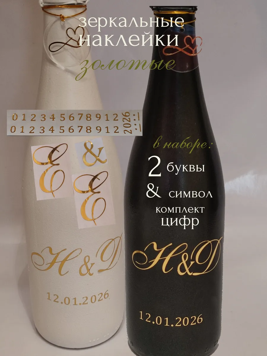 Набор наклеек буквы инициалы и цифры из зеркального золота – отличный выбор для украшения бутылок и бокалов. Они добавят изысканности и блеска Вашему мероприятию, придавая ему особую изюминку. Эти наклейки идеально подходят для нанесения свадебные бутылки или бокалы с гладкой поверхностью. Благодаря специальной клеевой основе они легко фиксируются на поверхности. Вы сможете их использовать не только для стеклянной посуды, но и для окрашенных поверхностей, создавая уникальные декорации. Идеальный выбор для свадебных торжеств. Эти декоративные элементы помогут создать особую атмосферу романтики и подчеркнет статус торжества. В наборе: 2 буквы - инициалы для 2-х бокалов или бутылок, символ бесконечности, комплект цифр для любой даты 2026 г. Размер букв 3 см в высоту отлично подходит под стандартные размеры свадебных аксессуаров, благодаря этому вы сможете создать гармоничный и стильный дизайн, соответствующий атмосфере и особенностям Вашего мероприятия. В карточках товаров магазина можно выбрать любые инициалы алфавита.