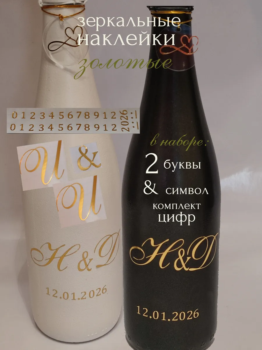 Набор наклеек буквы инициалы и цифры из зеркального золота – отличный выбор для украшения бутылок и бокалов. Они добавят изысканности и блеска Вашему мероприятию, придавая ему особую изюминку. Эти наклейки идеально подходят для нанесения свадебные бутылки или бокалы с гладкой поверхностью. Благодаря специальной клеевой основе они легко фиксируются на поверхности. Вы сможете их использовать не только для стеклянной посуды, но и для окрашенных поверхностей, создавая уникальные декорации. Идеальный выбор для свадебных торжеств. Эти декоративные элементы помогут создать особую атмосферу романтики и подчеркнет статус торжества. В наборе: 2 буквы - инициалы для 2-х бокалов или бутылок, символ бесконечности, комплект цифр для любой даты 2026 г. Размер букв 3 см в высоту отлично подходит под стандартные размеры свадебных аксессуаров, благодаря этому вы сможете создать гармоничный и стильный дизайн, соответствующий атмосфере и особенностям Вашего мероприятия. В карточках товаров магазина можно выбрать любые инициалы алфавита.