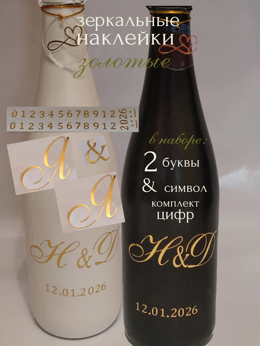 Набор наклеек буквы инициалы и цифры из зеркального золота – отличный выбор для украшения бутылок и бокалов. Они добавят изысканности и блеска Вашему мероприятию, придавая ему особую изюминку. Эти наклейки идеально подходят для нанесения свадебные бутылки или бокалы с гладкой поверхностью. Благодаря специальной клеевой основе они легко фиксируются на поверхности. Вы сможете их использовать не только для стеклянной посуды, но и для окрашенных поверхностей, создавая уникальные декорации. Идеальный выбор для свадебных торжеств. Эти декоративные элементы помогут создать особую атмосферу романтики и подчеркнет статус торжества. В наборе: 2 буквы - инициалы для 2-х бокалов или бутылок, символ бесконечности, комплект цифр для любой даты 2026 г. Размер букв 3 см в высоту отлично подходит под стандартные размеры свадебных аксессуаров, благодаря этому вы сможете создать гармоничный и стильный дизайн, соответствующий атмосфере и особенностям Вашего мероприятия. В карточках товаров магазина можно выбрать любые инициалы алфавита.