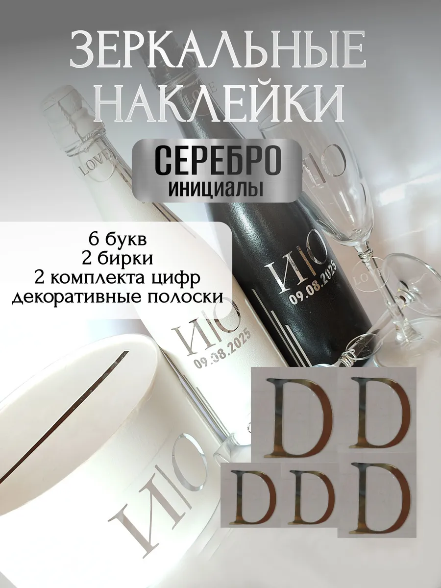 Набор наклеек из зеркального серебра – отличный выбор для украшения бутылок и бокалов? Они добавят изысканности и блеска Вашему мероприятию, придавая ему особую изюминку. Эти наклейки идеально подходят для нанесения на любые бутылки и свадебные фужеры с гладкой поверхностью. Благодаря специальной клеевой основе они легко фиксируются на поверхности. Вы сможете их использовать не только для стеклянной посуды, но и для окрашенных поверхностей, создавая уникальные декорации. Идеальный выбор для свадебных торжеств. Эти декоративные элементы помогут создать особую атмосферу романтики и подчеркнет статус торжества. В наборе 6 букв ( инициалы для 2-х бутылок, для 2-х бокалов, для семейного банка), две бирки с надписью "LOVE", два серебристых шнура для бирок, два комплекта цифр (для любой дата 2025-2026), декоративные серебрянные полоски. Размеры наклеек отлично подходят под стандартные размеры свадебных аксессуаров, благодаря этому вы сможете создать гармоничный и стильный дизайн, соответствующий атмосфере и особенностям Вашего мероприятия. В карточках товаров магазина можно выбрать любые инициалы алфавита. Очистите бутылки от этикеток. Осторожно отделите прозрачную с наклейкой от белой подложки чтобы все элементы остались на прозрачной пленке. Нанесите наклейку на выбранное место, аккуратно разгладьте. Удалите прозрачную пленку. свадебные наклейки на бутылки; наклейки на бокалы; наклейки на шампанское свадебное; шаблоны свадебных наклеек; свадебные наклейки купить; наклейки на свадебные бокалы; наклейки на свадебные бутылки; свадебные наклейки на бутылки шампанского;