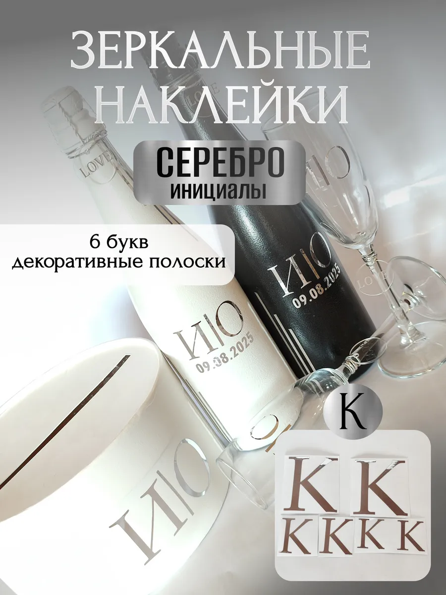 Набор наклеек из зеркального серебра – отличный выбор для украшения бутылок и бокалов? Они добавят изысканности и блеска Вашему мероприятию, придавая ему особую изюминку. Эти наклейки идеально подходят для нанесения на любые бутылки и свадебные фужеры с гладкой поверхностью. Благодаря специальной клеевой основе они легко фиксируются на поверхности. Вы сможете их использовать не только для стеклянной посуды, но и для окрашенных поверхностей, создавая уникальные декорации. Идеальный выбор для свадебных торжеств. Эти декоративные элементы помогут создать особую атмосферу романтики и подчеркнет статус торжества. В наборе 6 букв ( инициалы для 2-х бутылок, для 2-х бокалов, для семейного банка), декоративные серебрянные полоски. Размеры наклеек отлично подходят под стандартные размеры свадебных аксессуаров, благодаря этому вы сможете создать гармоничный и стильный дизайн, соответствующий атмосфере и особенностям Вашего мероприятия. В карточках товаров магазина можно выбрать любые инициалы алфавита. Очистите бутылки от этикеток. Осторожно отделите прозрачную с наклейкой от белой подложки чтобы все элементы остались на прозрачной пленке. Нанесите наклейку на выбранное место, аккуратно разгладьте. Удалите прозрачную пленку. свадебные наклейки на бутылки; наклейки на бокалы; наклейки на шампанское свадебное; шаблоны свадебных наклеек; свадебные наклейки купить; наклейки на свадебные бокалы; наклейки на свадебные бутылки; свадебные наклейки на бутылки шампанского;