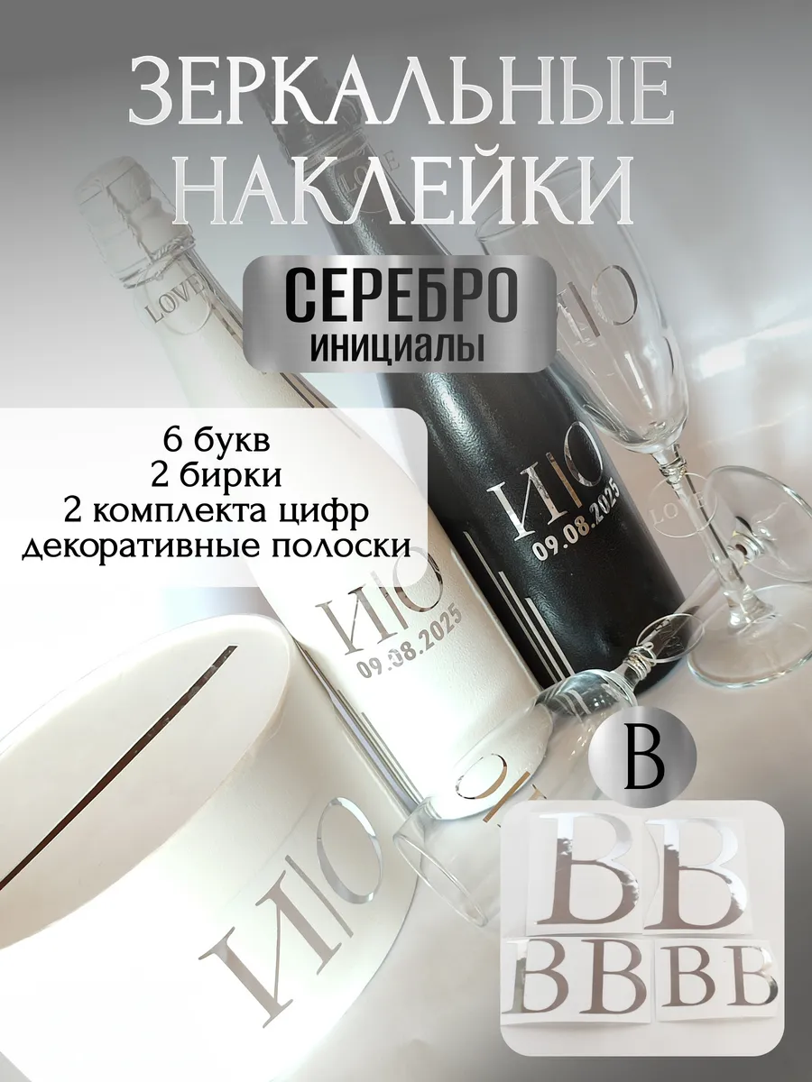 Набор наклеек из зеркального серебра – отличный выбор для украшения бутылок и бокалов? Они добавят изысканности и блеска Вашему мероприятию, придавая ему особую изюминку. Эти наклейки идеально подходят для нанесения на любые бутылки и свадебные фужеры с гладкой поверхностью. Благодаря специальной клеевой основе они легко фиксируются на поверхности. Вы сможете их использовать не только для стеклянной посуды, но и для окрашенных поверхностей, создавая уникальные декорации. Идеальный выбор для свадебных торжеств. Эти декоративные элементы помогут создать особую атмосферу романтики и подчеркнет статус торжества. В наборе 6 букв ( инициалы для 2-х бутылок, для 2-х бокалов, для семейного банка), две бирки с надписью "LOVE", два серебристых шнура для бирок, два комплекта цифр (для любой дата 2025-2026), декоративные серебрянные полоски. Размеры наклеек отлично подходят под стандартные размеры свадебных аксессуаров, благодаря этому вы сможете создать гармоничный и стильный дизайн, соответствующий атмосфере и особенностям Вашего мероприятия. В карточках товаров магазина можно выбрать любые инициалы алфавита. Очистите бутылки от этикеток. Осторожно отделите прозрачную с наклейкой от белой подложки чтобы все элементы остались на прозрачной пленке. Нанесите наклейку на выбранное место, аккуратно разгладьте. Удалите прозрачную пленку. свадебные наклейки на бутылки; наклейки на бокалы; наклейки на шампанское свадебное; шаблоны свадебных наклеек; свадебные наклейки купить; наклейки на свадебные бокалы; наклейки на свадебные бутылки; свадебные наклейки на бутылки шампанского;