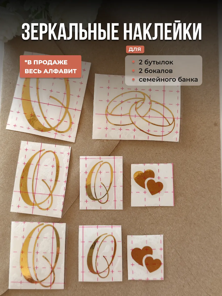 Почему наклейки из зеркального золота инициалы – отличный выбор для украшения бутылок и бокалов? Они добавят изысканности и блеска Вашему мероприятию, придавая ему особую изюминку. Эти наклейки идеально подходят для нанесения на любые бутылки и свадебные фужеры с гладкой поверхностью. Благодаря специальной клеевой основе они легко фиксируются на поверхности. Вы сможете их использовать не только для стеклянной посуды, но и для окрашенных поверхностей, создавая уникальные декорации. Идеальный выбор для свадебных торжеств. Эти декоративные элементы помогут создать особую атмосферу романтики и подчеркнет статус торжества. В наборе 8 штук наклеек, инициалы для свадебной казны, бутылок, фужеров, а также наклейка колец и сердец. Размеры наклеек отлично подходят под стандартные размеры свадебных аксессуаров, благодаря этому вы сможете создать гармоничный и стильный дизайн, соответствующий атмосфере и особенностям Вашего мероприятия. В карточках товаров магазина можно выбрать любые инициалы алфавита. Очистите бутылки от этикеток. Осторожно отделите прозрачную с наклейкой от белой подложки чтобы все элементы остались на прозрачной пленке. Нанесите наклейку на выбранное место, аккуратно разгладьте. Удалите прозрачную пленку. свадебные наклейки на бутылки; наклейки на бокалы; наклейки на шампанское свадебное; шаблоны свадебных наклеек; свадебные наклейки купить; наклейки на свадебные бокалы; наклейки на свадебные бутылки; свадебные наклейки на бутылки шампанского;