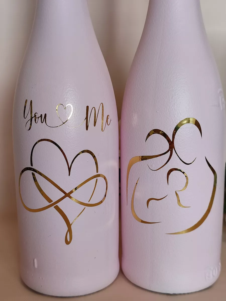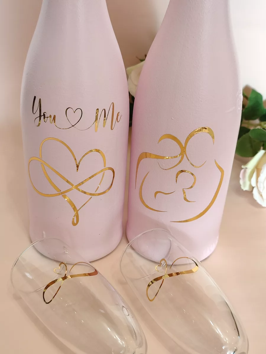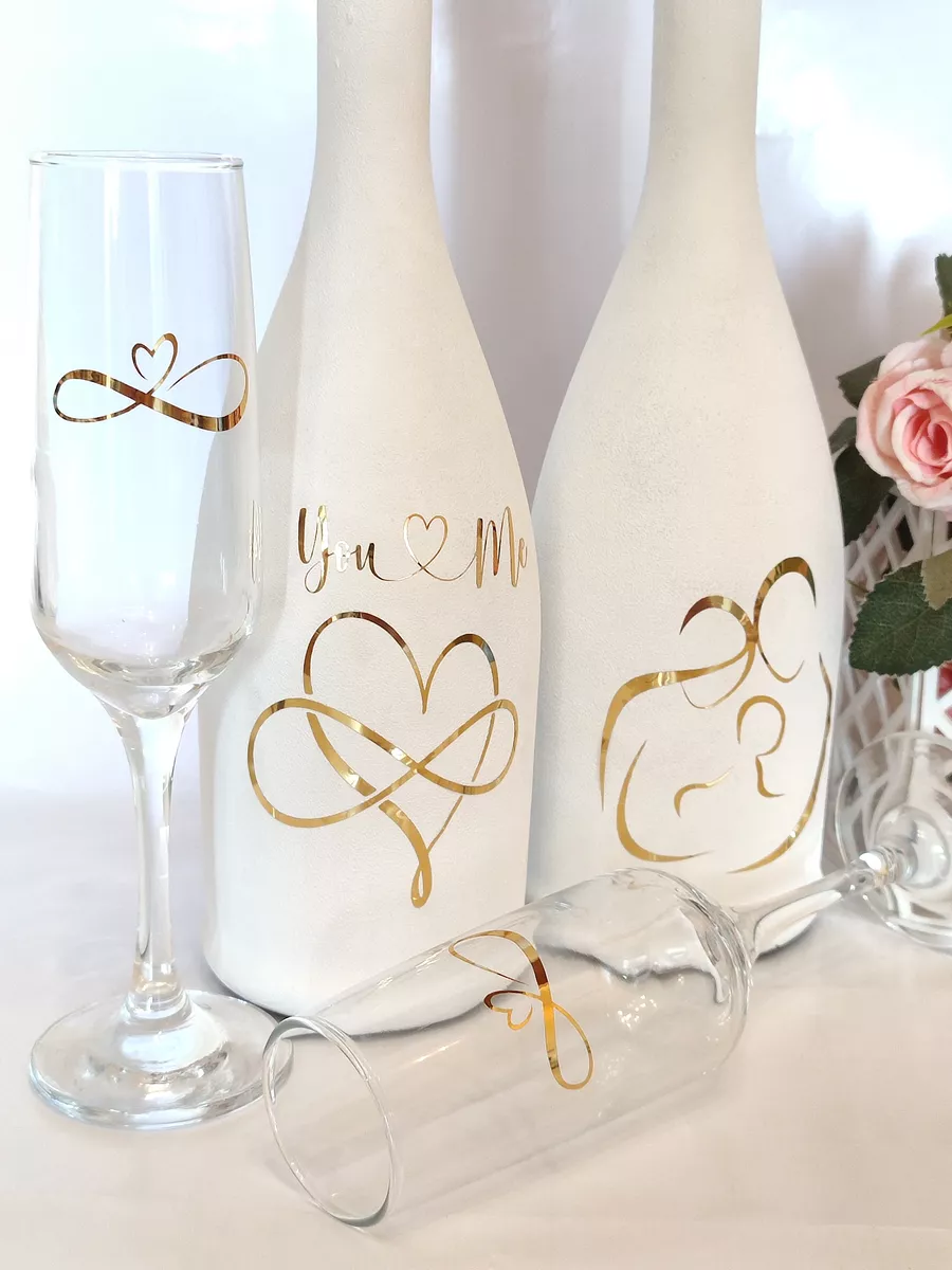 Эти наклейки идеально подходят для нанесения на любые бутылки и свадебные фужеры с гладкой поверхностью. Благодаря специальной клеевой основе они легко фиксируются на поверхности. Вы сможете их использовать не только для стеклянной посуды, но и для окрашенных поверхностей, создавая уникальные декорации.