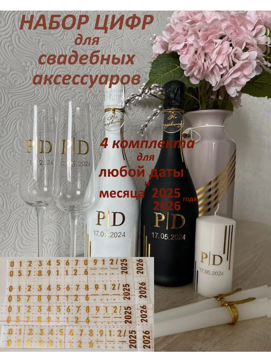 Наклейки цифры из зеркального золота – отличный выбор для украшения свадебных бутылок и аксессуаров. Они добавят вашу памятную дату на свадебные аксессуары . Наклейки идеально подходят для нанесения на любые бутылки и свадебные аксессуары с гладкой поверхностью. Благодаря специальной клеевой основе они легко фиксируются на поверхности. Вы сможете их использовать не только для стеклянной посуды, но и для окрашенных поверхностей, создавая уникальные декорации. Идеальный выбор для свадебных торжеств. Эти декоративные элементы помогут создать особую атмосферу романтики и подчеркнет статус торжества. В наборе 4 комплекта цифр, из которого вы соберете любую дату и месяц 2025,2026 года ( один комплект-одна дата) Размеры наклеек отлично подходят под стандартные размеры свадебных аксессуаров, благодаря этому вы сможете создать гармоничный и стильный дизайн, соответствующий атмосфере и особенностям Вашего мероприятия. Отрежте нужную цифру. Осторожно отделите прозрачную с наклейкой от белой подложки чтобы все элементы остались на прозрачной пленке. Нанесите наклейку на выбранное место, аккуратно разгладьте. Удалите прозрачную пленку. свадебные наклейки на бутылки; наклейки на бокалы; наклейки на шампанское свадебное; шаблоны свадебных наклеек; свадебные наклейки купить; наклейки на свадебные бокалы; наклейки на свадебные бутылки; свадебные наклейки на бутылки шампанского;