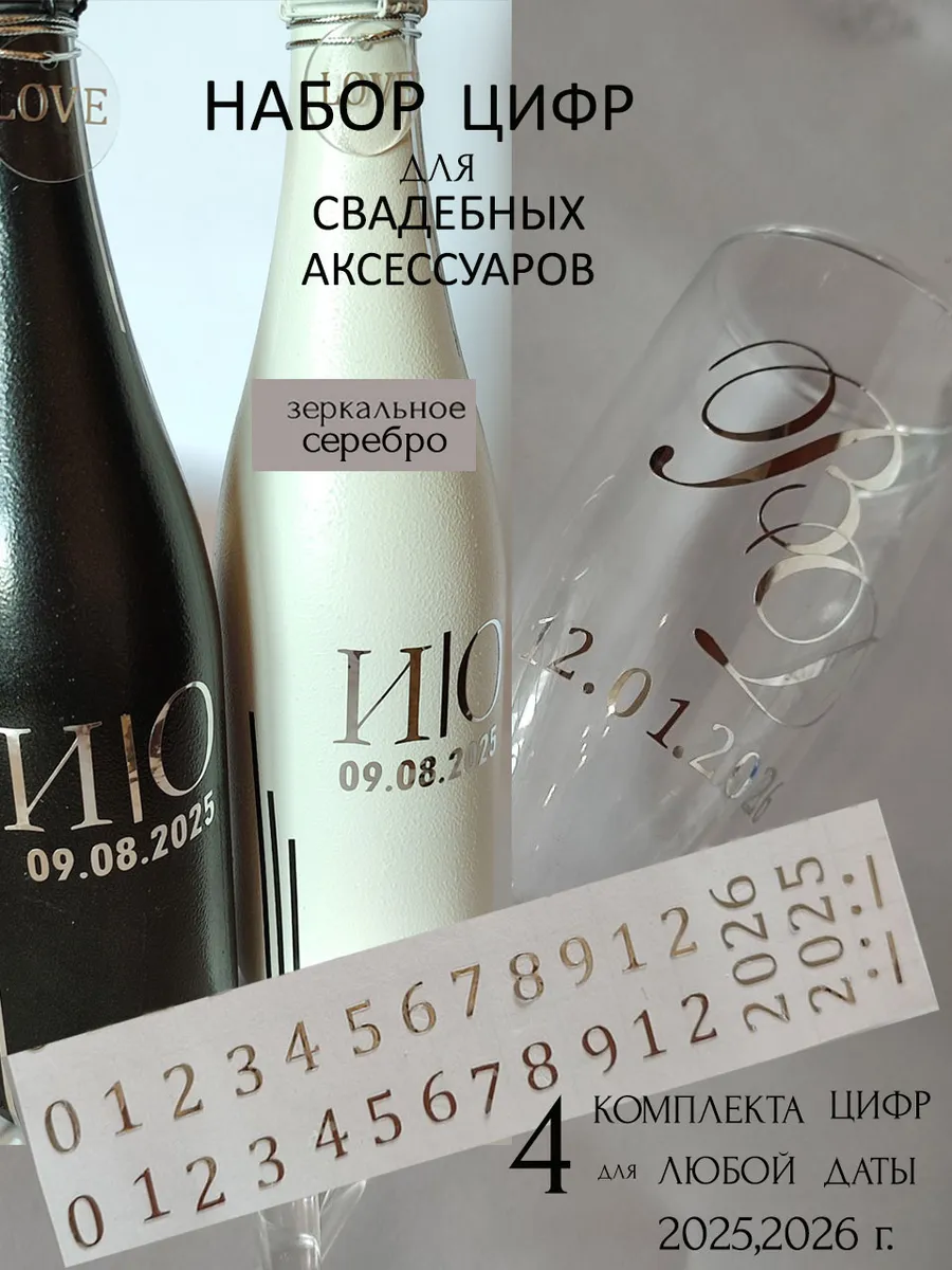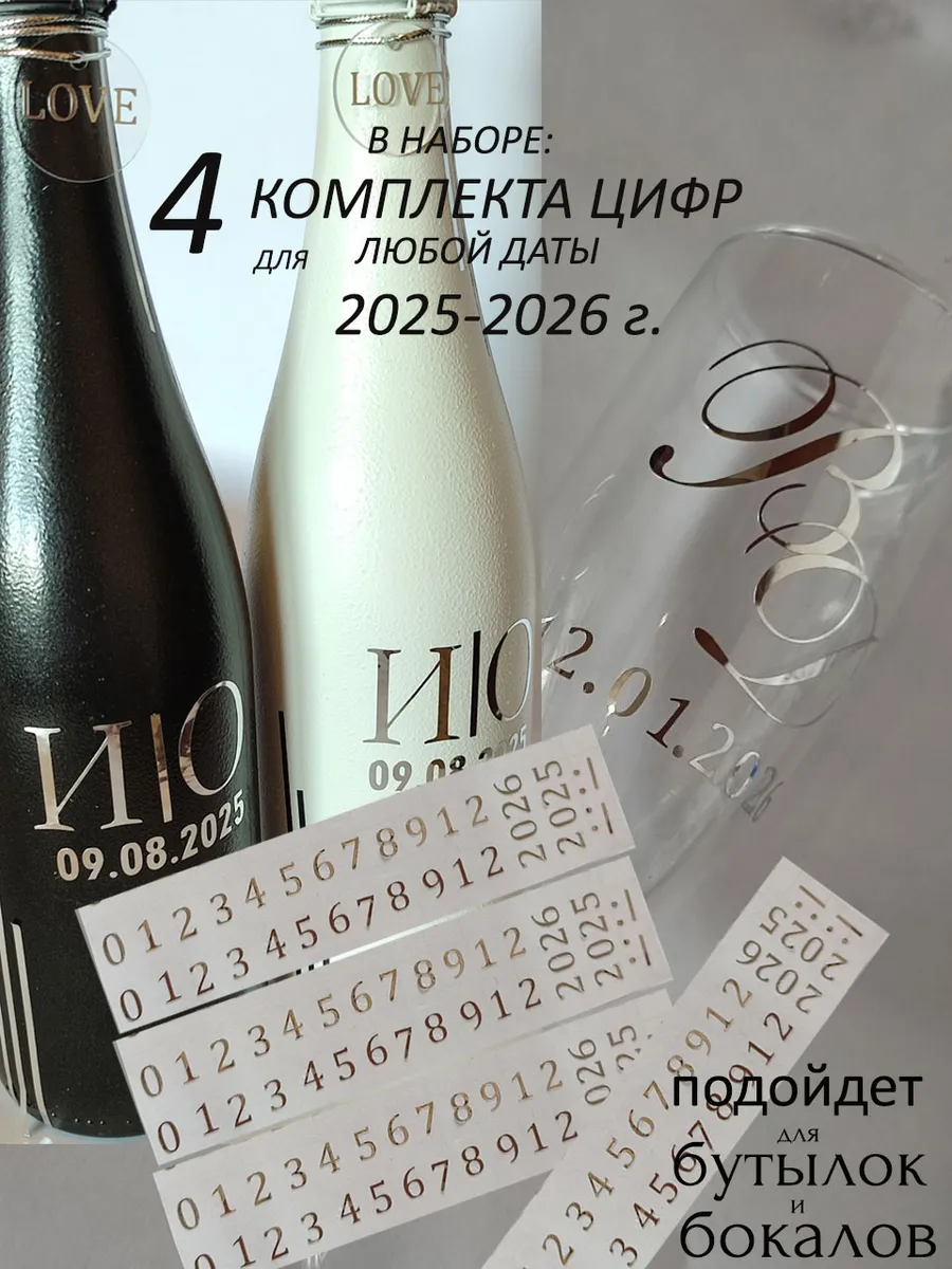 Наклейки цифры из зеркального золота – отличный выбор для украшения свадебных бутылок и бокалов. Они добавят вашу памятную дату на свадебные аксессуары . Наклейки идеально подходят для нанесения на любые бутылки и бокалы с гладкой поверхностью. Благодаря специальной клеевой основе они легко фиксируются на поверхности. Вы сможете их использовать не только для стеклянной посуды, но и для окрашенных поверхностей, создавая уникальные декорации. Идеальный выбор для свадебных торжеств. Эти декоративные элементы помогут создать особую атмосферу романтики и подчеркнет статус торжества. В наборе 4 комплекта цифр, из которого вы соберете любую дату и месяц 2025,2026 года ( один комплект-одна дата) Размеры наклеек отлично подходят под стандартные размеры свадебных аксессуаров, благодаря этому вы сможете создать гармоничный и стильный дизайн, соответствующий атмосфере и особенностям Вашего мероприятия. Отрежте нужную цифру. Осторожно отделите прозрачную с наклейкой от белой подложки чтобы все элементы остались на прозрачной пленке. Нанесите наклейку на выбранное место, аккуратно разгладьте. Удалите прозрачную пленку. свадебные наклейки на бутылки; наклейки на бокалы; наклейки на шампанское свадебное; шаблоны свадебных наклеек; свадебные наклейки купить; наклейки на свадебные бокалы; наклейки на свадебные бутылки; свадебные наклейки на бутылки шампанского;