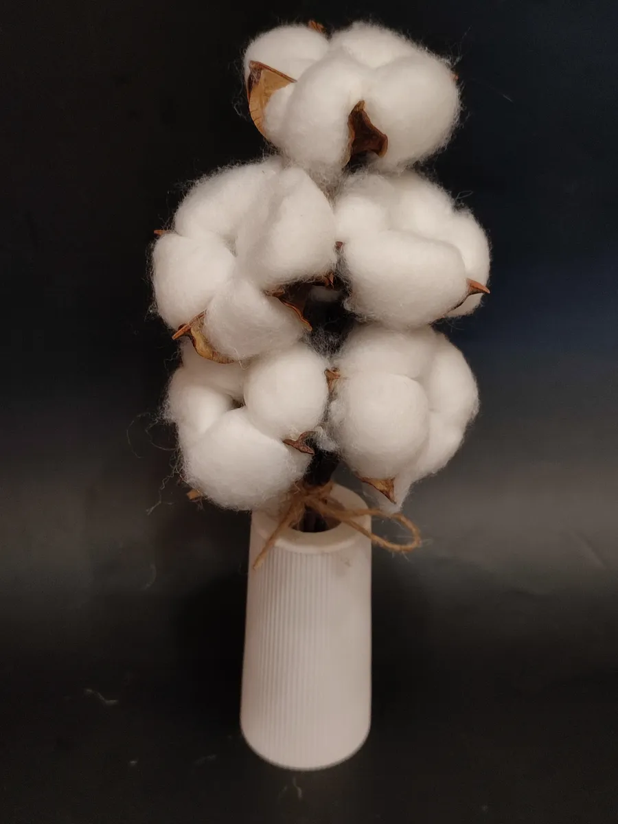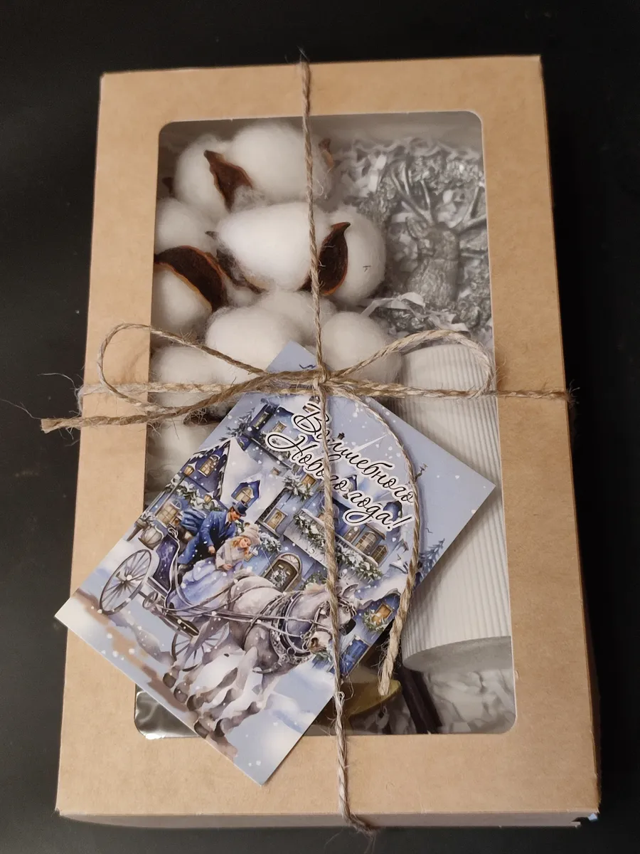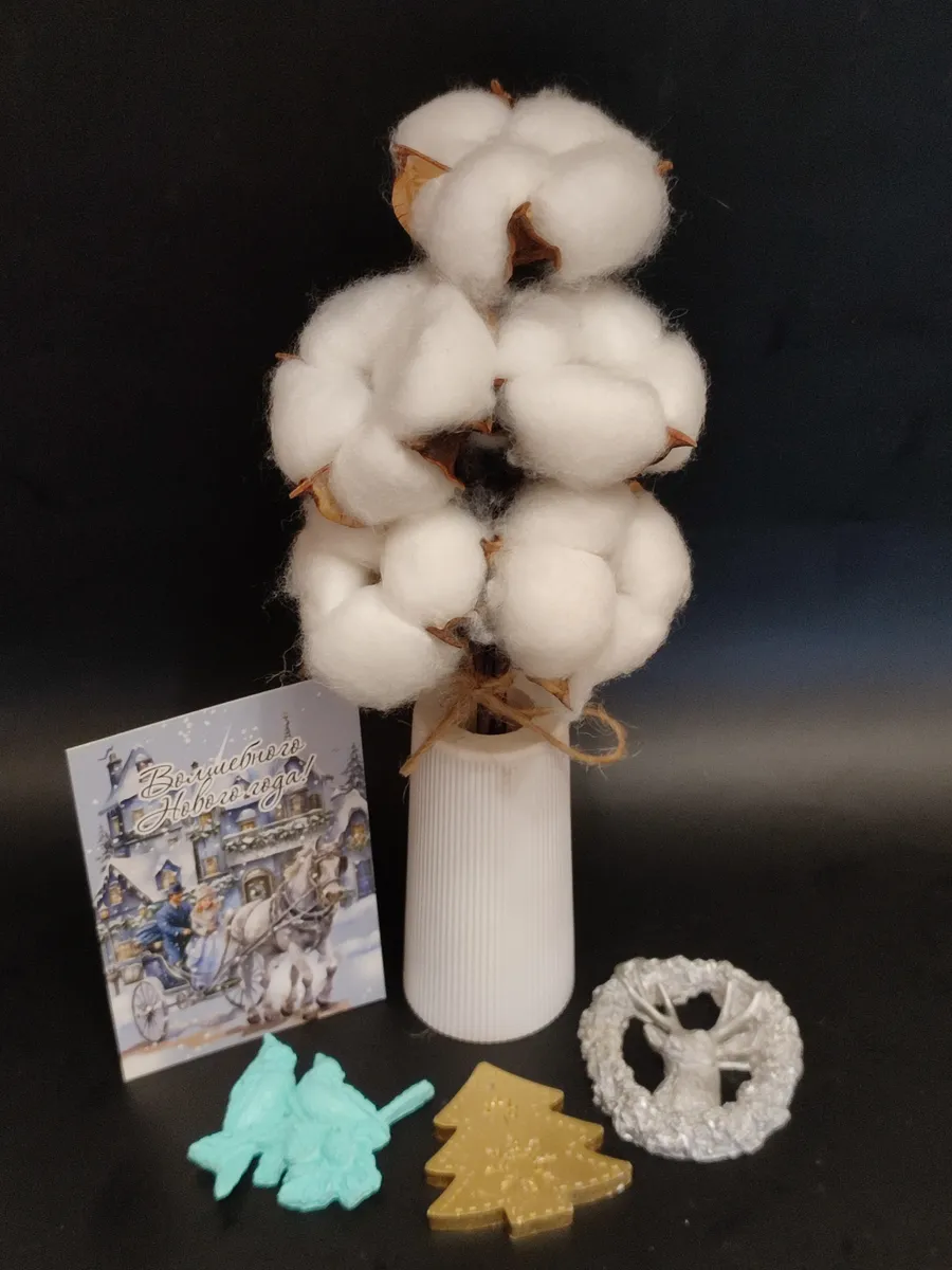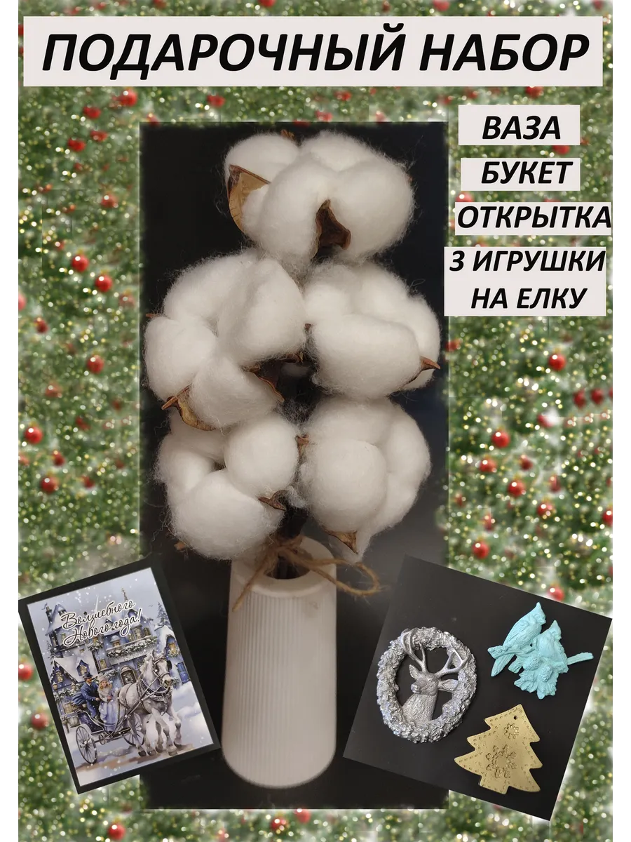 В подарочном наборе ваза из гипса, букет из хлопка, который идеально подойдет для новогоднего букета в качестве подарка на Новый год, открытка для пожеланий, елочные игрушки.