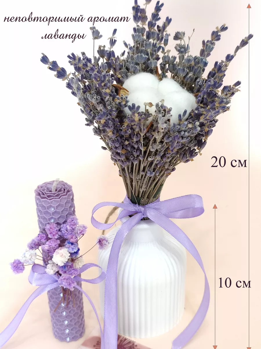 нежный и изысканный букет сухоцветов, который состоит из лаванды и хлопка, упакованный в подарочную бумагу.