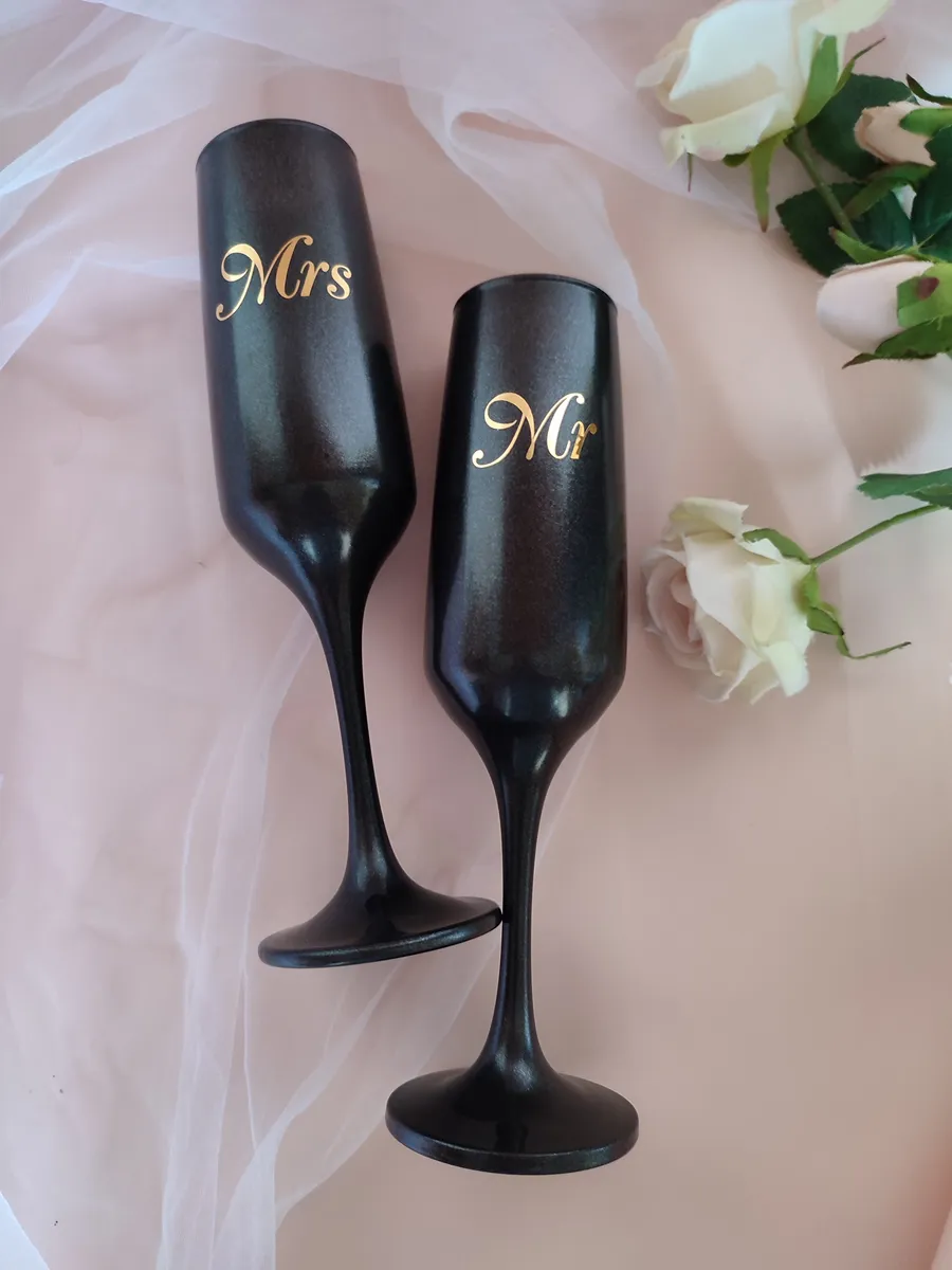 Бокалы для шампанского в стиле минимализма с наклейкой Mr. и Mrs. выполнены в классической стандартной форме, что делает их элегантными и утонченными. Их простота и изящество привлекают наших покупателей, ценящих красоту в деталях.
