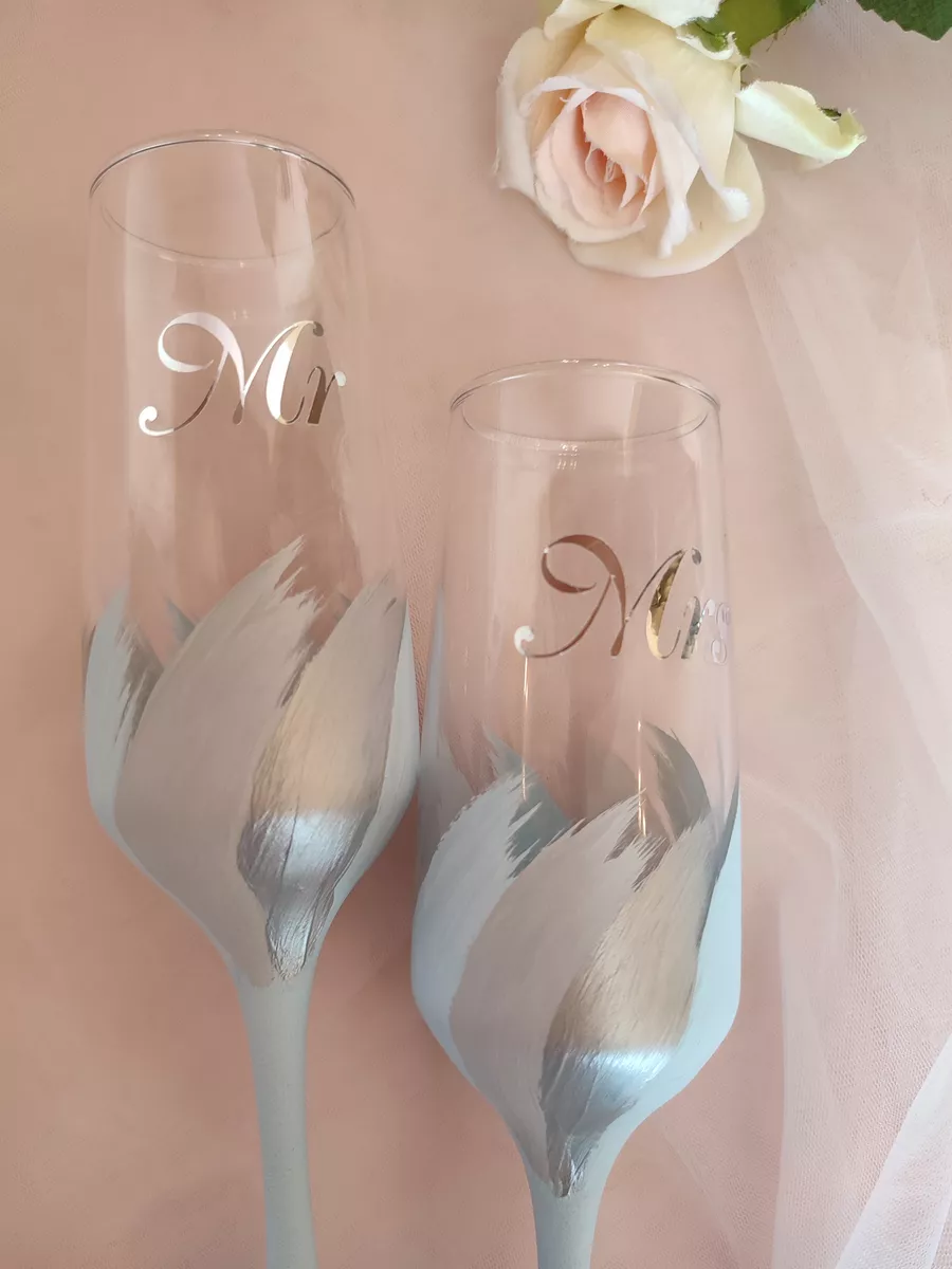 Свадебные бокалы Mr. Mrs ручной работы - это не просто предмет сервировки стола, это символ любви и счастья молодой пары. Их стиль, форма и утонченность делают их идеальным выбором для особого дня. Пусть эти бокалы станут неотъемлемой частью вашего свадебного торжества, напоминая о важности каждого момента вашей совместной жизни.