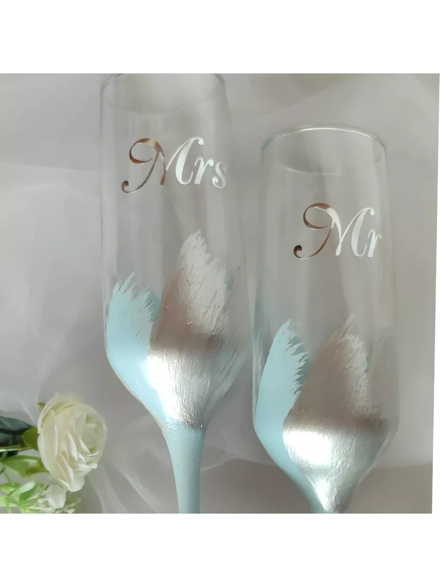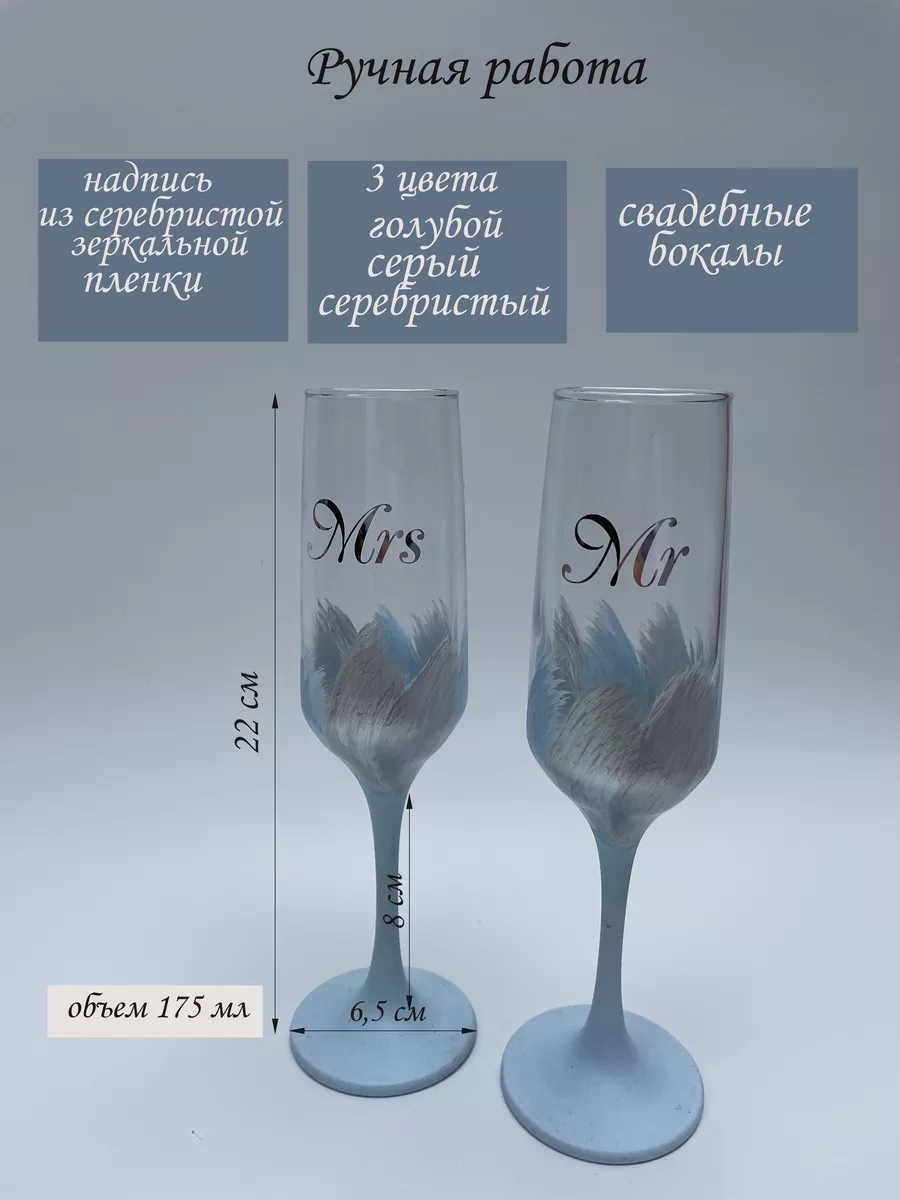 Эти свадебные бокалы идеально дополнят образ молодых, создавая атмосферу романтики и торжества. Ручная работа придает каждому бокалу индивидуальность, а наклейка Mr. и Mrs. напоминает о важности и особенности этого дня.